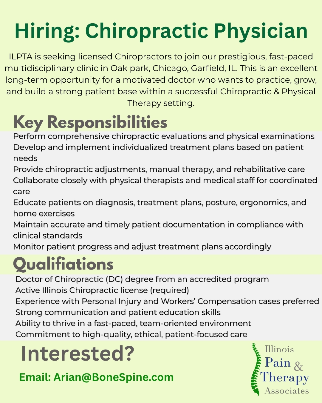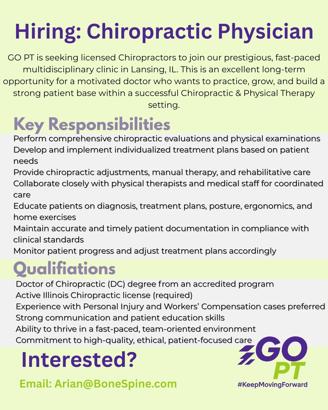 GO PT and ILPTA are seeking licensed Chiropractors to join our prestigious, fast-paced multidisciplinary clinic in Lansing, and Chicago, Oak Park, Garfield, IL. This is an excellent long-term opportunity for a motivated doctor who wants to practice, grow, and build a strong patient base within a successful Chiropractic & Physical Therapy setting.