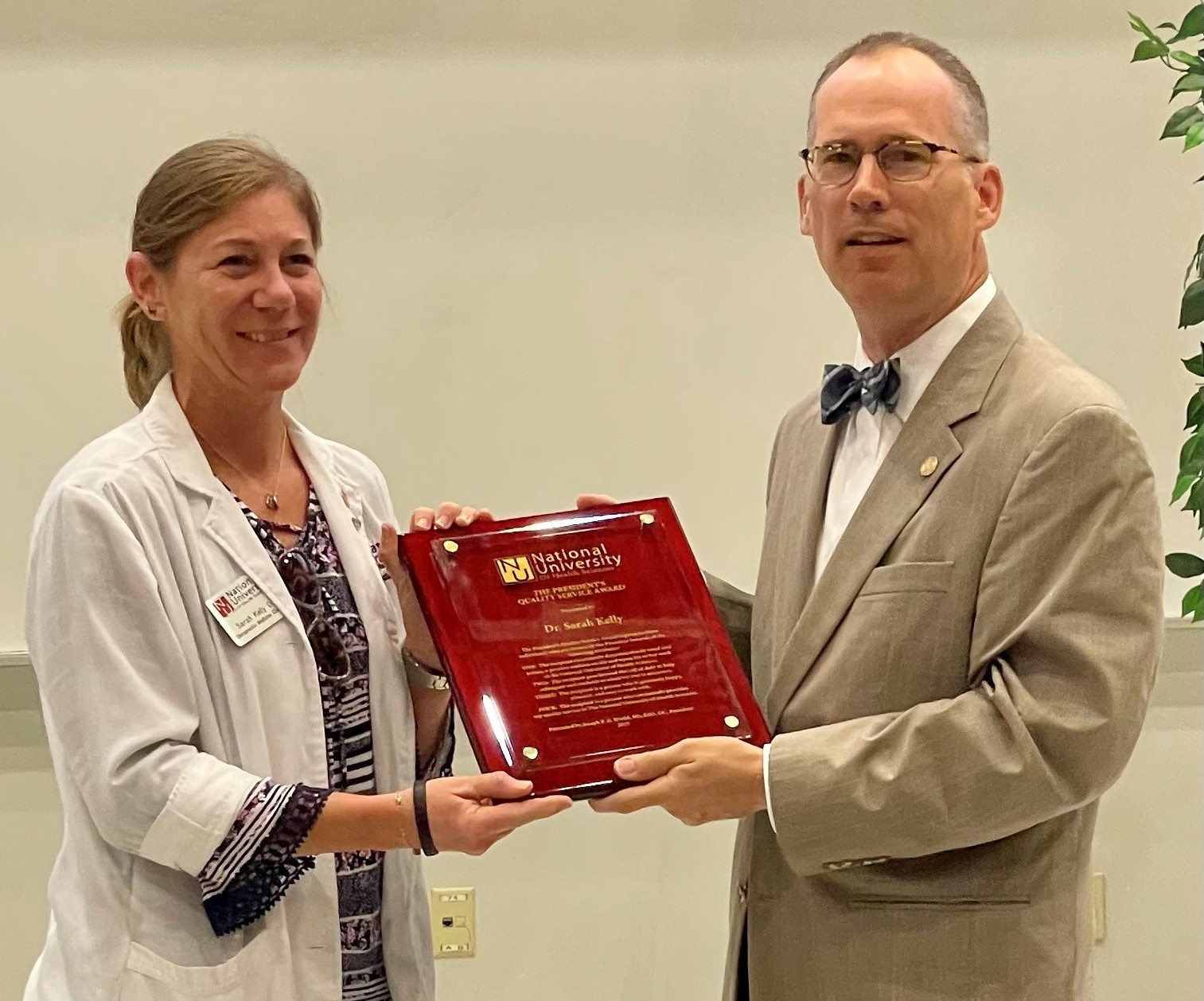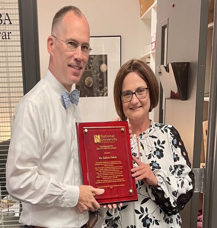 Sarah Kelly, DC ’99, MSACP ’21, Assistant Professor of Clinical Sciences at NUHS-Florida, and Izabela Dubak, Registrar, received the President’s Quality Service Award. President Joseph P.D. Stiefel, MS, EdD, DC hand picks each award recipient based on four criteria: those who consistently demonstrate a positive outlook on life and upon his or her work, those who go beyond the call of duty to help colleagues and students, those who are genuinely happy, pleasant and easy to work with and lastly, those who consistently provide top quality service to National University of Health Sciences.